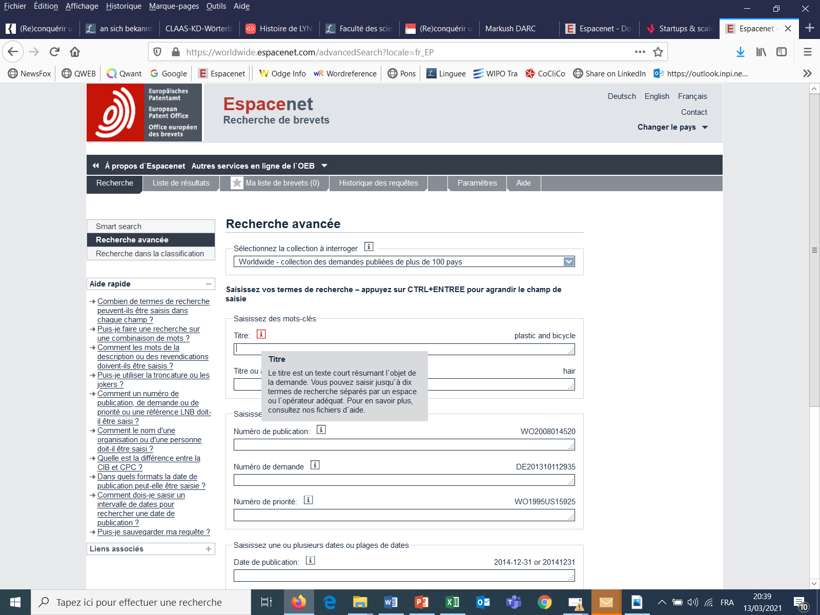 Il y a ensuite le mode de recherche dite « avancée » (voir figure 2), qui se présente sous la forme d’un formulaire d’une grande simplicité. Les infobulles ou autres vignettes accompagnant les 10 champs de recherche de ce formulaire permettent en effet au premier coup d’œil de savoir où l’on cherche (dans le titre, dans les numéros de publication, les noms de déposant ….) et sous quelle forme on doit entrer la requête.