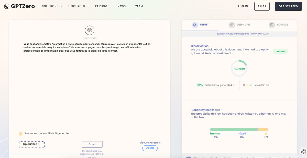 Il est donc possible de coupler deux outils gratuits, mais si l’on veut les deux fonctionnalités dans un seul outil, il faudra payer. Nous avons donc concentré nos tests sur les outils IA conçus spécifiquement pour repérer le contenu généré par les IA génératives.
