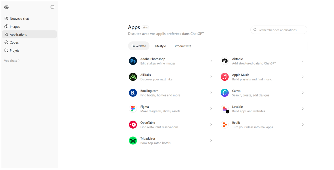 Le GPT Store, bien que proposant aujourd'hui plusieurs millions de GPTs personnalisés, n'a pas généré l'engouement initialement attendu par OpenAI. Les Applications ChatGPT, lancées fin 2025, partent d'un principe différent : là où un GPT personnalisé enrichit simplement ChatGPT avec du contexte supplémentaire, une Application connecte ChatGPT à un service externe existant, permettant ainsi d'afficher des interfaces interactives, d'accéder à des données en temps réel et d'effectuer des actions directement dans la conversation.